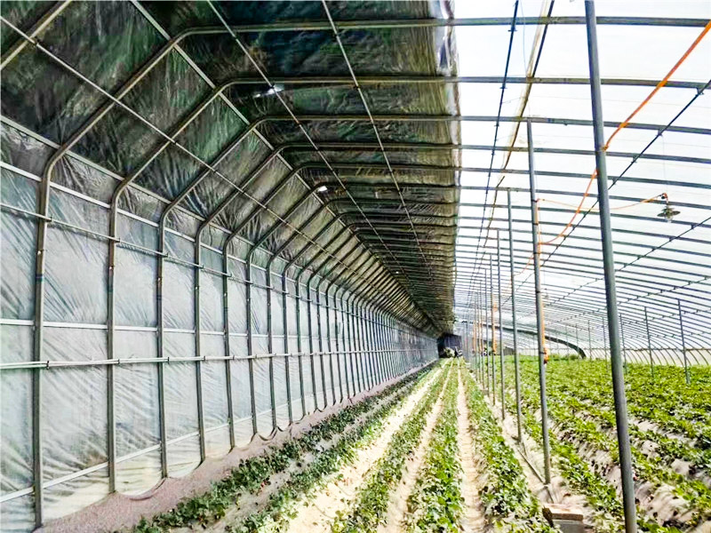 此温室覆盖材料为薄膜(PO膜、PEP膜、长寿膜、PVA膜等),使用年限为3~5年,公司质保5年。